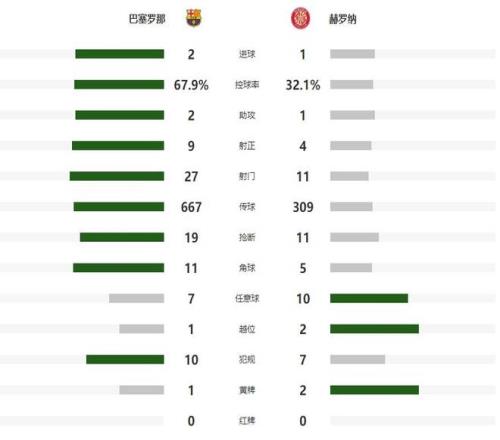 不过主场球迷并没有开心太久,第20分钟维特塞尔用一记倒挂金钩,帮助赫罗纳将比分追至1平,起势的赫罗纳本有机会反超比分,但瓦纳特和波图的单刀机会都没有把握住,第32分钟巴萨前场再次赢得定位球,拉什福德的攻门被门框弹出,半场结束前,赫罗纳再次获得单刀机会,希尔发力太大,皮球高出了横梁。