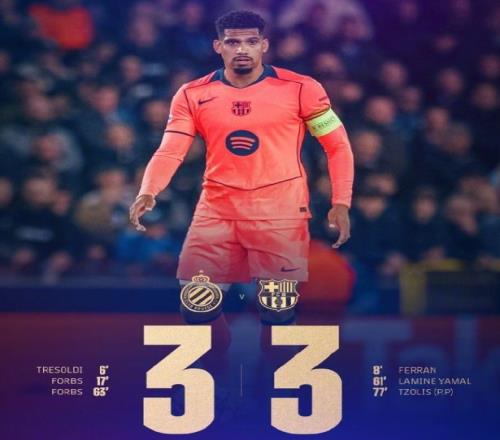 易边再战,第61分钟,场上迎来精彩配合,亚马尔在弧顶外得球后突破重围,与费尔明完成撞墙配合,接到后者回做后,禁区内外脚背低射远角破门,巴萨2-2再度扳平比分。第64分钟,瓦纳肯断球后送出精准斜塞,博尔赫斯再次前插获得单刀机会,以一记轻巧的挑射攻破什琴斯尼的十指关,完成梅开二度的同时,帮助布鲁日3-2第三次取得领先。
