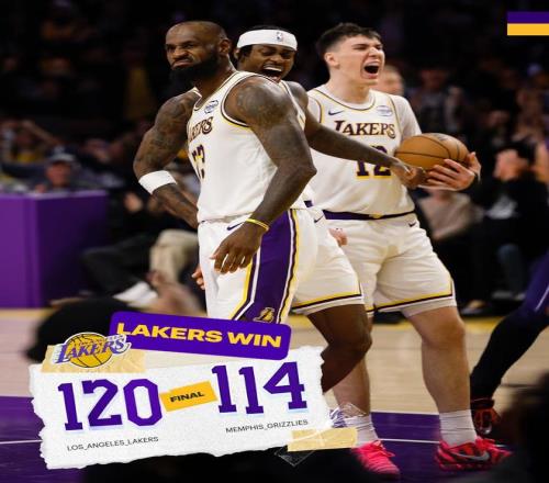 NBA常规赛继续进行,洛杉矶湖人队(22胜11负)拿到连胜。东契奇得到36分、9个篮板和8次助攻,勒布朗得到26分和10次助攻,他们率队末节打出小高潮确立胜局,湖人队在主场以120-114险胜孟菲斯灰熊队(15胜20负)。湖人队拿到2连胜,他们赛季横扫灰熊队,灰熊队遭遇4连败。