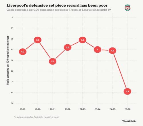 包括点球在内,利物浦54%的失球都来自定位球。自2019-20赛季以来,所有英超球队中,只有水晶宫(2025-26赛季,61%)单赛季定位球失球比例更高。