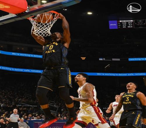 勇士队的波兹姆斯基得到24分、6个篮板和4次助攻,库里得到19分和11次助攻,巴特勒得到17分和4次助攻,他在第三节伤退。希尔德得到16分和4个篮板,普斯特得到15分和9个篮板,穆迪得到13分和4个篮板,霍福德得到10分和8个篮板,勇士队连续四场投中至少20个三分球,这追平联盟纪录。热火队的鲍威尔得到21分,维金斯得到18分和5个篮板,冯特奇奥得到13分和8个篮板,威尔得到15分和4个篮板,哈克斯得到10分、5个篮板和9次助攻,阿德巴约得到4分和12个篮板。